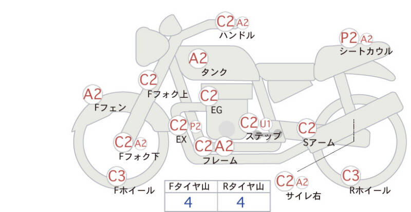 Красным маркером на схеме отмечаются места косметических повреждений.