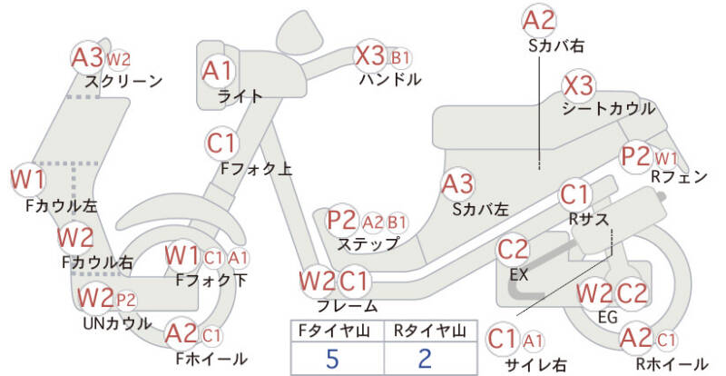 Красным маркером на схеме отмечаются места косметических повреждений.