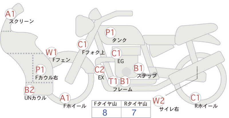 Красным маркером на схеме отмечаются места косметических повреждений.