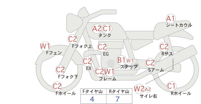 Красным маркером на схеме отмечаются места косметических повреждений.