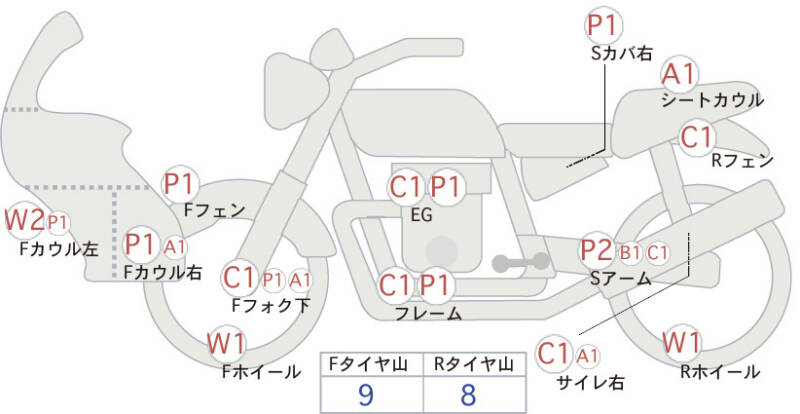 Красным маркером на схеме отмечаются места косметических повреждений.