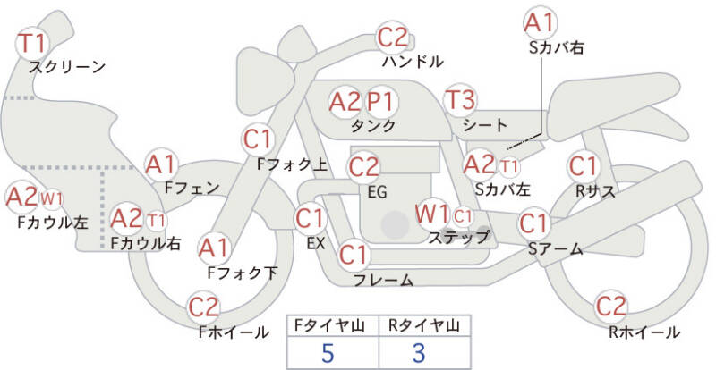 | Правая часть переднего обтекателя | царапина <2>; порвано, трещина <1> |