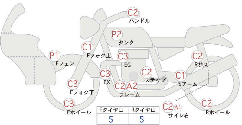 Красным маркером на схеме отмечаются места косметических повреждений.