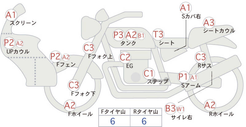 | Топливный бак | царапины, необходима подкраска <3>; царапина <2>; вмятина, деформация <1> |