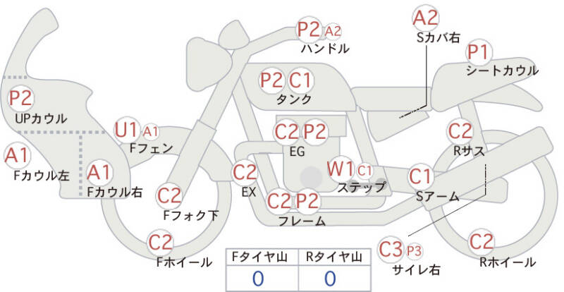 Красным маркером на схеме отмечаются места косметических повреждений.