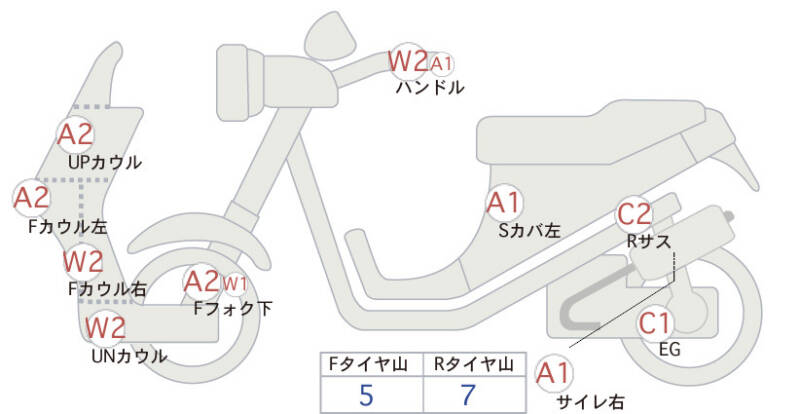 | Нижняя часть передней вилки | царапина <2>; царапины, потертость <1> |