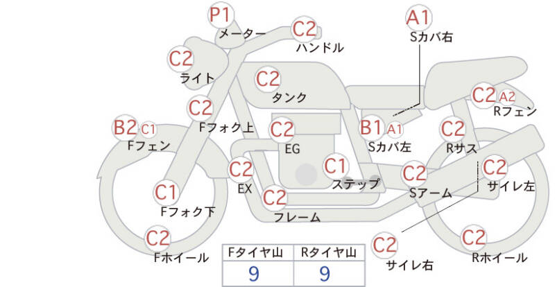Красным маркером на схеме отмечаются места косметических повреждений.