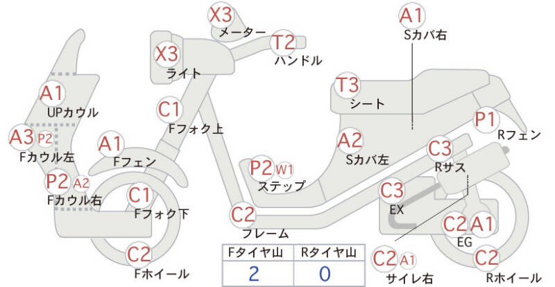 | Подножки | царапины, необходима подкраска <2>; царапины, потертость <1> |