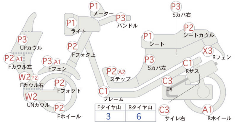 | Правая часть переднего обтекателя | царапины, потертость <2>; царапины, необходима подкраска <2> |